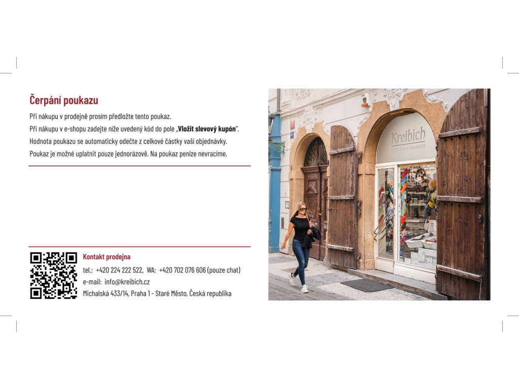 Dárkový poukaz můžete uplatnit v e-shopu www.kreibich.cz nebo v naší kamenné prodejně v centru Prahy. Po autorizaci objednávky Vám poukaz s unikátním kódem zašleme v elektronické podobě na e-mail uvedený v objednávce. Pokud si přejete poukaz v tištěné podobě, doručíme Vám jej na adresu uvedenou v objednávce. Platnost poukazu je 12 měsíců a není možné jej vyměnit za peníze.